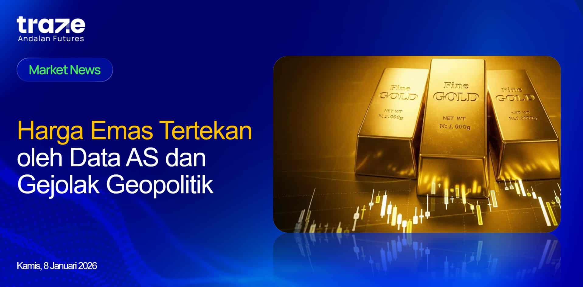 Harga emas melemah ke kisaran USD 4.440 per ons pada Kamis (08/01), melanjutkan penurunan dari sesi sebelumnya seiring pelaku pasar mencermati data ekonomi Amerika Serikat yang beragam. Penurunan tajam pada jumlah lowongan kerja November mengindikasikan perlambatan permintaan tenaga kerja, sementara pertumbuhan payroll swasta Desember tercatat lebih rendah dari ekspektasi, menambah tekanan pada logam mulia.