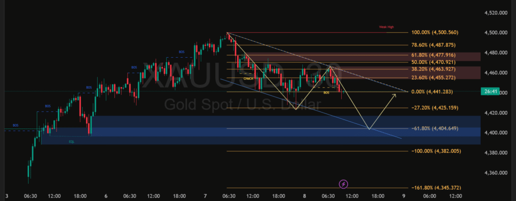 Secara teknikal, XAUUSD terlihat bergerak dalam saluran turun (descending channel) setelah gagal bertahan di area puncak sebelumnya. Harga saat ini berada di sekitar zona Fibonacci 0% – 23,6%, yang menjadi area krusial bagi arah lanjutan. Struktur pasar menunjukkan Break of Structure (BOS) ke bawah, menandakan dominasi seller masih kuat, sementara beberapa kali pantulan hanya membentuk lower high yang memperkuat bias bearish jangka pendek.
