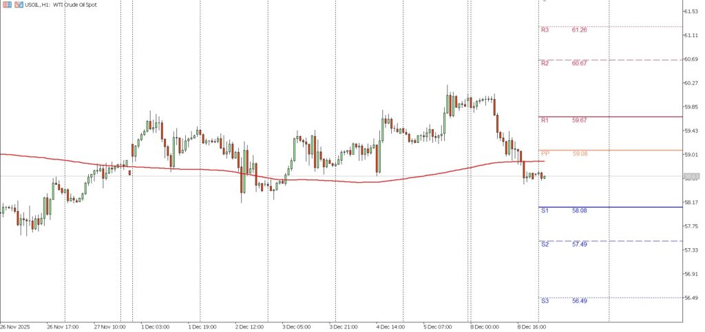 Harga minyak mentah WTI bergerak di bawah $59 per barel pada Selasa (09/12) setelah turun 2% pada sesi sebelumnya. Pelemahan ini terjadi karena ekspektasi kelebihan pasokan yang dinilai lebih kuat dibandingkan risiko geopolitik yang sedang berlangsung. Pasar menantikan rilis laporan terbaru dari EIA dan OPEC+ minggu ini untuk mendapatkan panduan terkini mengenai proyeksi permintaan serta penawaran energi global.