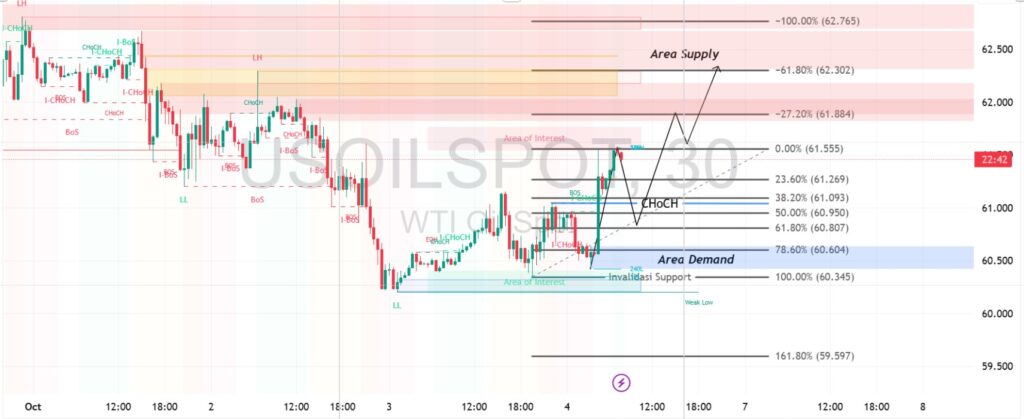 Harga minyak WTI kembali menunjukkan tanda pemulihan setelah sempat menyentuh area demand di sekitar $60,60 per barel, yang kini berperan sebagai zona penyangga kuat. Dari sisi teknikal, pergerakan harga membentuk pola Change of Character (ChoCH) dan berpotensi melanjutkan kenaikan menuju area supply di kisaran $61,88–$62,30. Kenaikan ini menandakan minat beli mulai meningkat setelah tekanan jual yang cukup panjang dalam beberapa sesi terakhir.