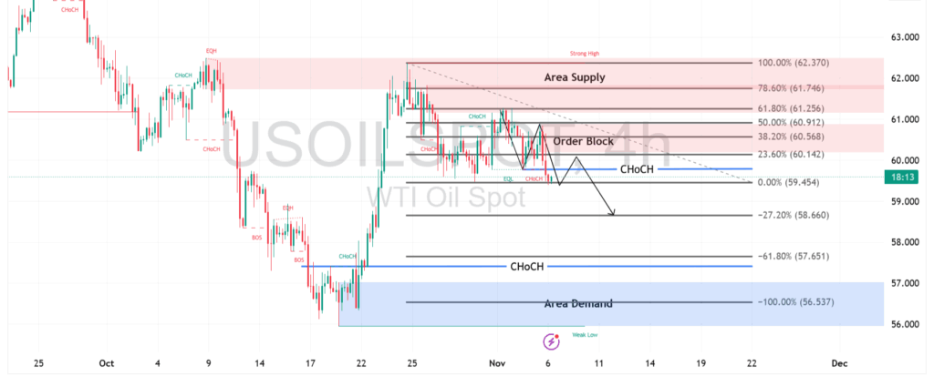 Harga minyak WTI terlihat melemah setelah gagal menembus zona supply di $61,70–$62,30. Area ini menjadi titik kuat yang menahan kenaikan harga. Pola Change of Character (ChoCH) muncul di sekitar area tersebut, menandakan potensi pembalikan arah dari naik ke turun. Tekanan jual juga diperkuat dengan terbentuknya order block di dekat level Fibonacci 50–61,8%.