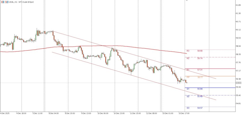 Selama berada di bawah pivot 56,77, WTI berpotensi melanjutkan penurunan menuju support 55,94 hingga 55,40. Sinyal pembalikan arah baru akan muncul jika harga mampu menembus 57,31, namun untuk saat ini bias pergerakan masih condong melemah.