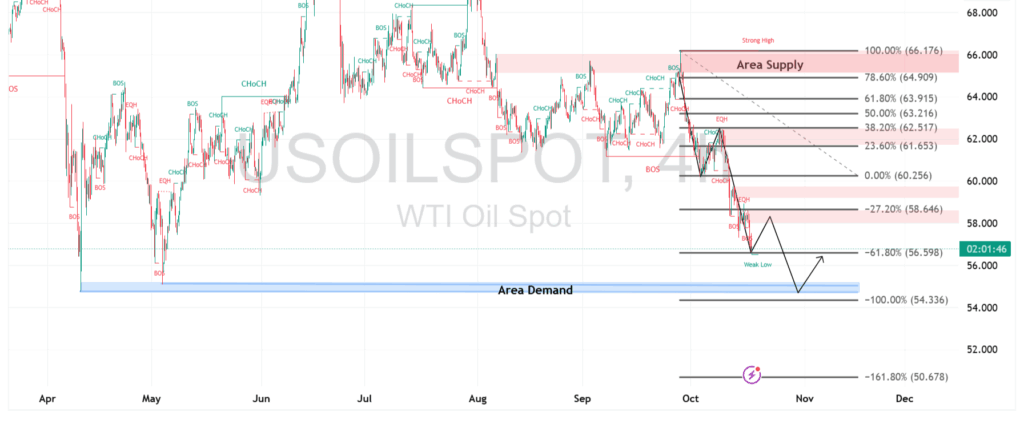 Sementara itu, kekhawatiran terhadap dampak penutupan pemerintahan AS yang memasuki pekan ketiga turut menekan sentimen pasar dan dolar AS. Pemerintah memperkirakan kerugian ekonomi mencapai sekitar $15 miliar per minggu. Investor kini menantikan rilis data persediaan minyak dari Energy Information Administration (EIA) yang akan memberikan petunjuk baru mengenai dinamika pasokan jangka pendek. Secara keseluruhan, ketegangan geopolitik dan ketidakpastian pasokan menahan pelemahan harga, menjaga WTI tetap stabil di kisaran $58 per barel.