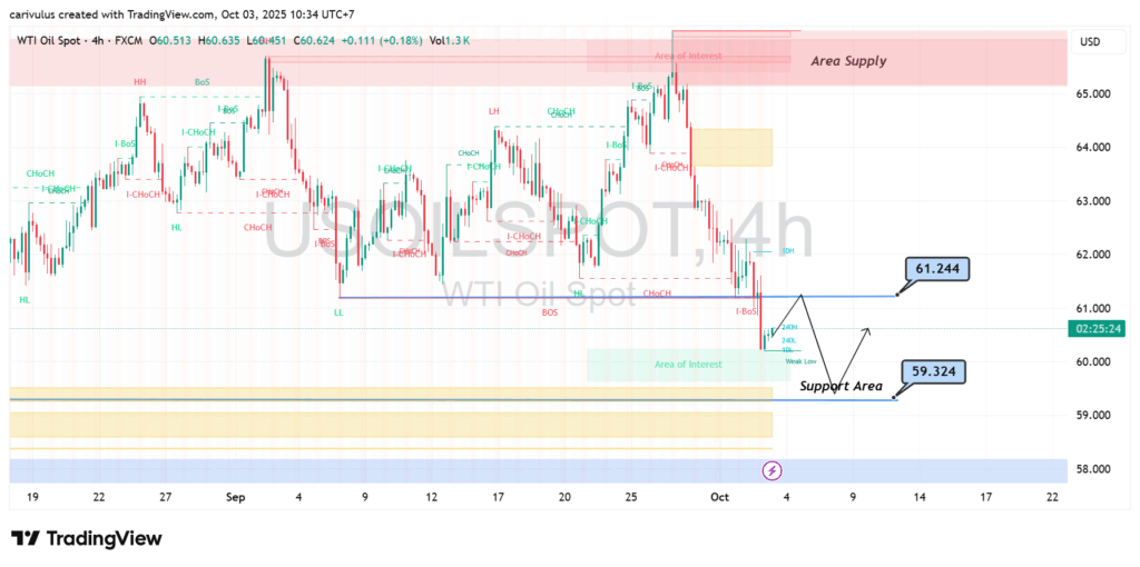 Namun, bila terjadi pantulan kuat dari area support, minyak berpeluang menguji kembali area supply di atas $61.000. Rebound ini bisa didukung faktor teknikal jangka pendek dan potensi aksi ambil untung dari pelaku pasar. Meski demikian, tren keseluruhan masih rapuh sehingga pergerakan harga tetap dipengaruhi kombinasi fundamental global dan dinamika pasar energi.