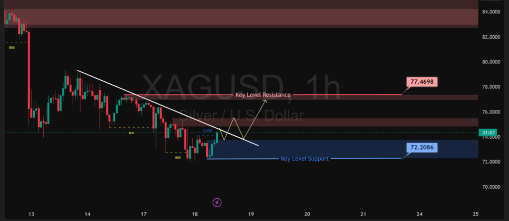 Selama perak mampu bertahan di atas 72,20, peluang rebound menuju resistance 75,50 hingga 77,40 tetap terbuka. Namun jika support ditembus, tekanan jual berisiko berlanjut dan membuka ruang pelemahan lebih dalam. Konfirmasi breakout di salah satu level kunci tersebut akan menjadi sinyal kuat untuk pergerakan berikutnya.
