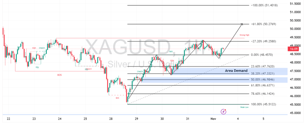 XAGUSD terlihat stabil dan menunjukkan potensi penguatan setelah terkonsolidasi di sekitar area $48,5. Berdasarkan grafik 1 jam, harga berhasil bertahan di atas zona demand area yang terbentuk antara $47,3 – $46,9, menandakan masih kuatnya minat beli di level bawah. Struktur pasar juga memperlihatkan pola higher low yang menegaskan momentum bullish belum hilang sepenuhnya.