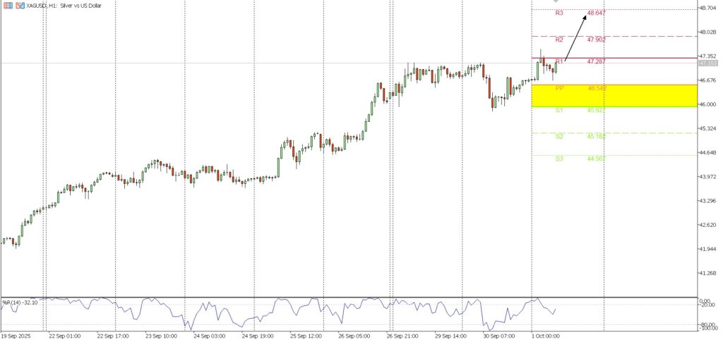 Harga perak (XAG/USD) menguat di atas $47,287, didorong sentimen safe haven pasca shutdown pemerintahan AS. Selama bertahan di atas pivot $46,542, tren naik berpotensi berlanjut.