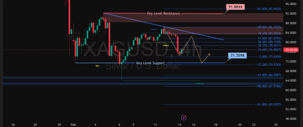 Pergerakan XAGUSD timeframe empat jam menunjukkan tekanan setelah harga gagal menembus area resistance 83.500 – 86.300. Munculnya change of character menandakan pergeseran momentum dari bullish ke bearish, diperkuat oleh penolakan di garis tren turun. Saat ini harga bergerak di bawah level Fibonacci 38,2% dan mendekati support penting di kisaran 73.900 – 71.500.