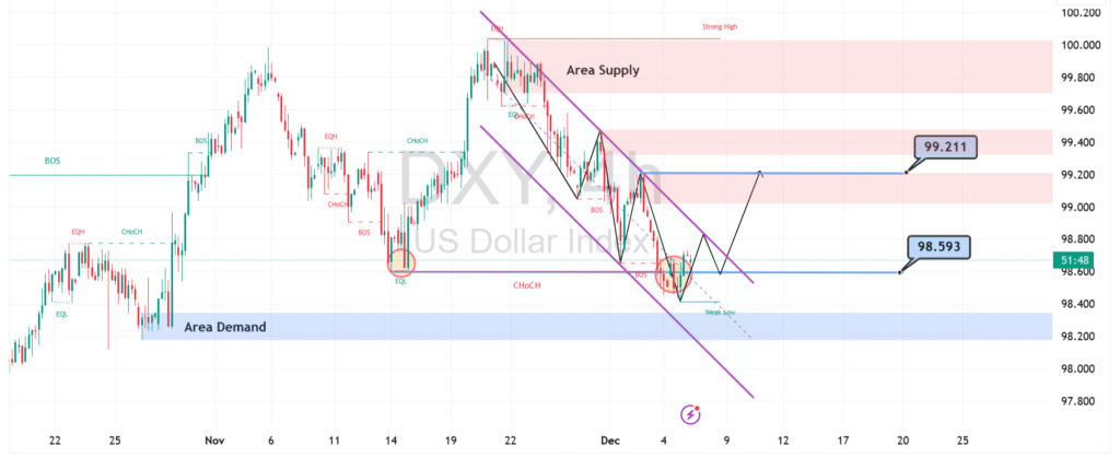 Jika momentum naik berlanjut, DXY berpotensi menuju resistance 98.59 dan target berikutnya di 99.21 yang berada dekat area supply. Retest channel atas juga mendukung skenario kenaikan jangka pendek.