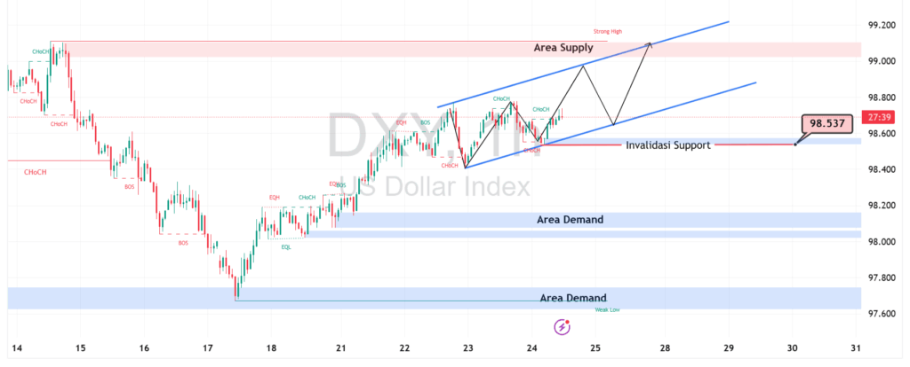 Meski demikian, potensi koreksi jangka pendek perlu diwaspadai jika harga menguji kembali batas bawah channel. Area demand 98.20–98.30 diperkirakan menjadi titik pantulan penting untuk melanjutkan momentum positif.