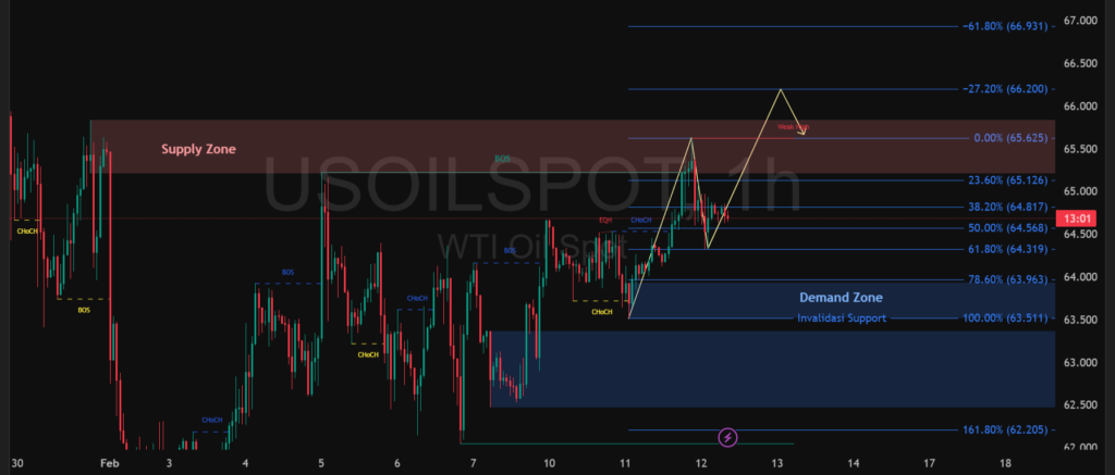 Secara teknikal, harga minyak WTI pada timeframe satu jam masih bergerak dalam struktur bullish setelah membentuk rangkaian higher low dan breakout area konsolidasi sebelumnya. Harga kini berada di sekitar level Fibonacci 38,2%–50% dengan pantulan dari demand zone yang terlihat kuat. Selama bertahan di atas area support tersebut, peluang melanjutkan kenaikan menuju supply zone di kisaran atas tetap terbuka, dengan potensi uji ulang area puncak terbaru.