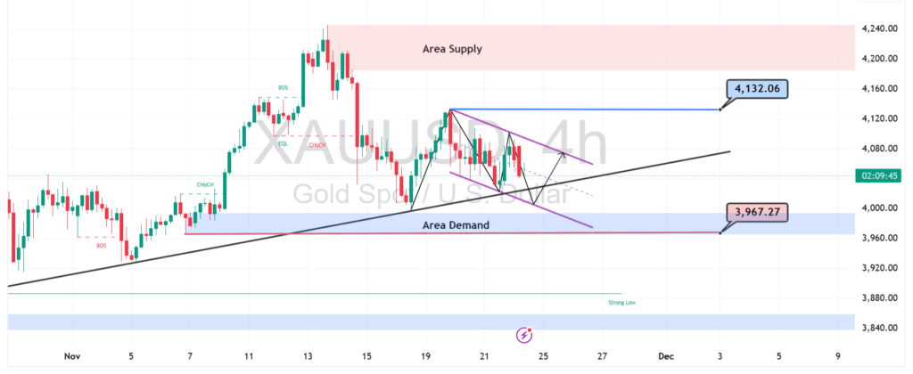 Target kenaikan terdekat berada di 4.132 jika harga mampu breakout dari wedge. Namun jika demand jebol, emas bisa turun lebih dalam menuju support berikutnya.