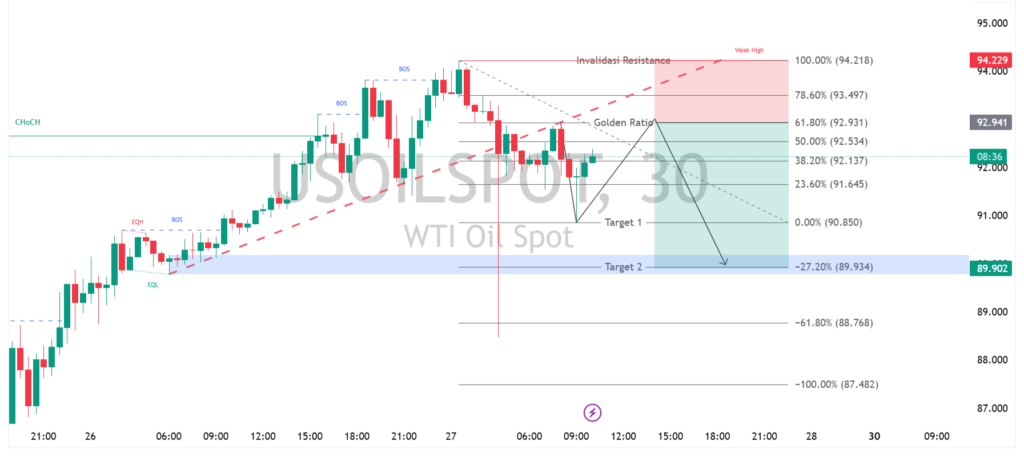 Harga WTI terlihat mulai kehilangan momentum setelah gagal menembus area resistance kuat di sekitar 94.20, membentuk pola weak high yang mengindikasikan potensi pelemahan lanjutan. Struktur pasar menunjukkan tanda perubahan karakter (CHoCH) setelah reli sebelumnya, diperkuat dengan penolakan di area Fibonacci 78.6%. Selama harga tertahan di bawah zona ini, tekanan jual cenderung masih dominan dalam jangka pendek.