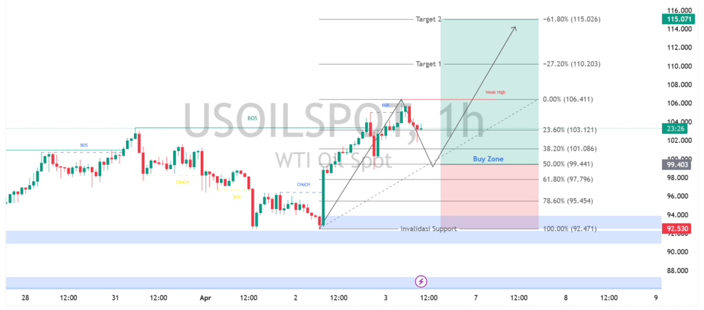 Harga minyak WTI pada timeframe 1 jam menunjukkan struktur bullish yang masih terjaga meski sempat mengalami koreksi. Terlihat adanya pola break of structure (BOS) yang mengonfirmasi dominasi buyer, diikuti fase pullback menuju area buy zone di kisaran 99–101. Area ini diperkuat oleh level Fibonacci 50% hingga 61,8%, yang sering menjadi titik reaksi harga sebelum melanjutkan tren naik. Selama harga mampu bertahan di atas zona tersebut, potensi rebound tetap terbuka dengan target kenaikan menuju resistance berikutnya di sekitar 110 hingga 115.