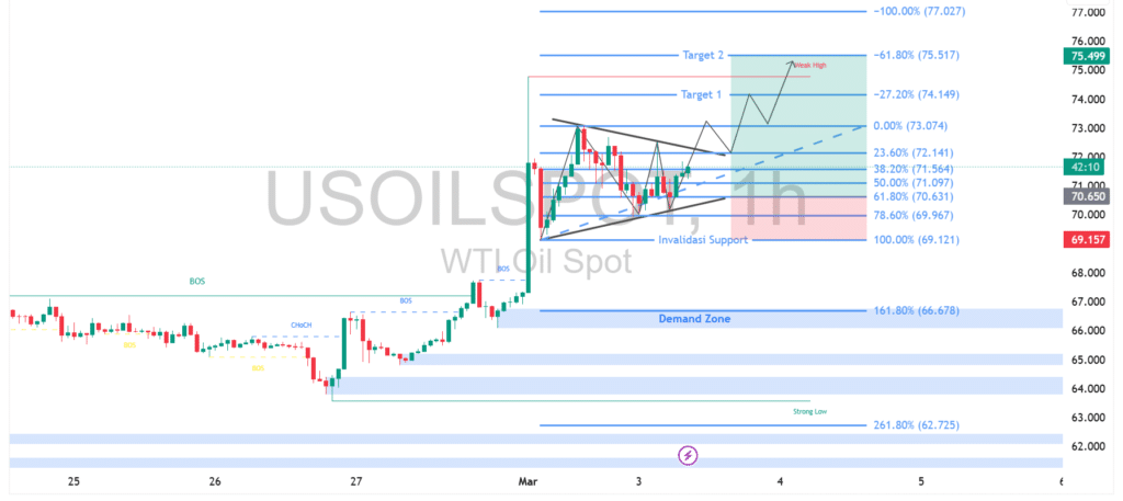 Harga minyak mentah WTI melonjak ke kisaran USD 71,6 per barel pada Selasa (03/03) setelah sebelumnya reli sekitar 6 persen. Kenaikan tajam ini dipicu meningkatnya ketegangan geopolitik di Timur Tengah, terutama kekhawatiran pasar terhadap potensi penutupan penuh Selat Hormuz. Presiden Amerika Serikat, Donald Trump, menyatakan bahwa negaranya akan melakukan “apa pun yang diperlukan” terkait konflik dengan Iran, memicu spekulasi bahwa perang dapat berlangsung lebih lama dari perkiraan.