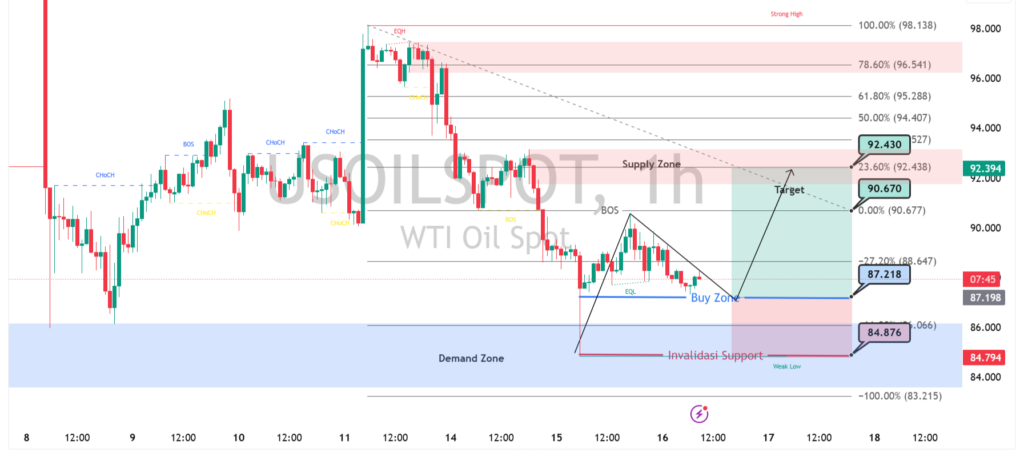 Pergerakan WTI Oil pada timeframe 1 jam menunjukkan tekanan bearish masih mendominasi setelah harga gagal mempertahankan area supply di sekitar 92.4. Struktur pasar membentuk lower high dan diikuti penurunan menuju area likuiditas bawah, mengindikasikan momentum jual belum sepenuhnya mereda. Saat ini harga bergerak mendekati zona buy di kisaran 87.2, yang berperan sebagai support sementara sekaligus area potensial untuk reaksi naik jangka pendek.