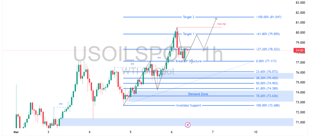 Pergerakan USOIL (WTI) pada grafik satu jam menunjukkan tren naik yang masih terjaga setelah harga berhasil menembus area break of structure di sekitar 77.10. Lonjakan tajam mendorong harga mendekati 80.00, sebelum akhirnya mengalami koreksi sehat dan bergerak konsolidasi di kisaran 78.30. Area ini menjadi support jangka pendek yang penting karena berada di atas level struktur sebelumnya, menandakan minat beli masih cukup kuat selama harga bertahan di atas zona tersebut.