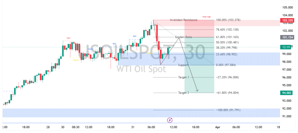 Pergerakan harga WTI Oil Spot pada timeframe 30 menit menunjukkan tekanan turun setelah gagal mempertahankan area resistance di sekitar 103.300. Terlihat adanya penolakan kuat di zona “weak high” yang memicu pembalikan arah, diperkuat dengan struktur lower high dan breakdown dari area konsolidasi sebelumnya. Harga kini bergerak di bawah level Fibonacci 50%, menandakan momentum bearish mulai mendominasi dalam jangka pendek.