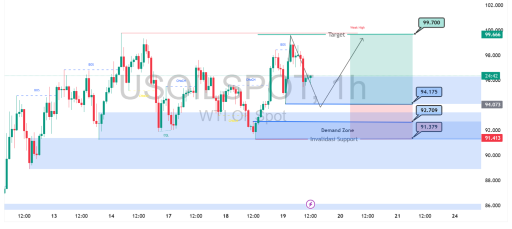 Pergerakan USOIL pada timeframe 1 jam menunjukkan struktur bullish yang mulai terbentuk setelah harga berhasil melakukan break of structure (BOS) di area sebelumnya. Kenaikan kuat mendorong harga mendekati resistance utama di sekitar 99.700, namun muncul penolakan yang memicu koreksi jangka pendek. Saat ini harga bergerak turun menuju area support terdekat di kisaran 94.175, yang menjadi zona penting untuk menjaga momentum naik tetap valid.