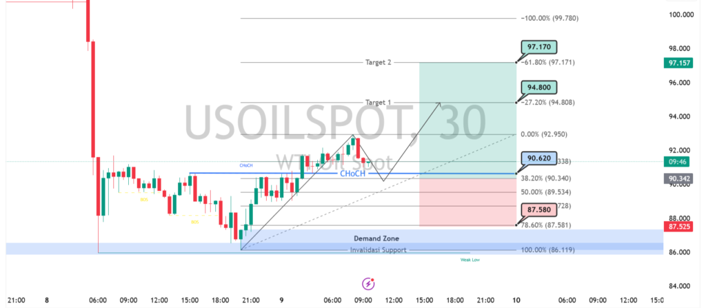 Di sisi lain, pelaku pasar tetap perlu mencermati kemungkinan koreksi apabila harga gagal bertahan di atas support tersebut. Penembusan ke bawah level 87.58 dapat memicu tekanan jual lanjutan menuju area demand lebih rendah. Garis tren naik yang terbentuk juga menjadi kunci arah pergerakan jangka pendek, sehingga konfirmasi breakout atau breakdown akan sangat menentukan langkah selanjutnya. Dengan volatilitas yang masih tinggi, strategi menunggu validasi sinyal menjadi pendekatan yang lebih bijak.