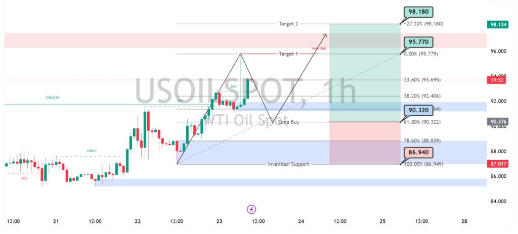 Harga minyak WTI pada timeframe 1 jam menunjukkan struktur bullish yang masih terjaga setelah berhasil mencetak higher high dan menembus area resistance sebelumnya. Pergerakan ini didukung oleh terbentuknya pola break of structure (BOS), yang mengindikasikan dominasi buyer dalam jangka pendek. Saat ini, harga berada di atas area support kunci sekitar 90.300, yang juga bertepatan dengan zona Fibonacci 61.8%, menjadikannya area potensial untuk melanjutkan kenaikan.