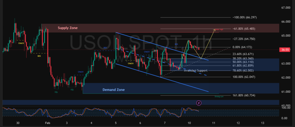 Pergerakan USOIL timeframe satu jam masih berada dalam fase konsolidasi di dalam struktur channel menurun. Harga saat ini bergerak di sekitar 64,17 dan mencoba bertahan di atas area support 63,60 – 62,85 yang bertepatan dengan zona demand serta level Fibonacci penting. Reaksi beli yang muncul dari area ini menunjukkan minat akumulasi mulai terbentuk setelah tekanan jual sebelumnya.