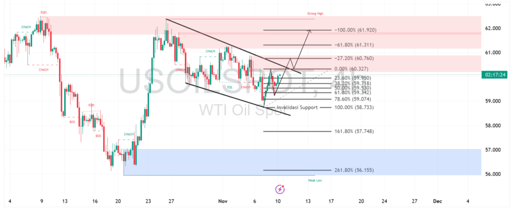 Jika dorongan beli berlanjut, WTI berpeluang menguji area resisten kuat di $61,9. Namun, jika harga turun di bawah $58,7, potensi koreksi kembali terbuka menuju zona $57.