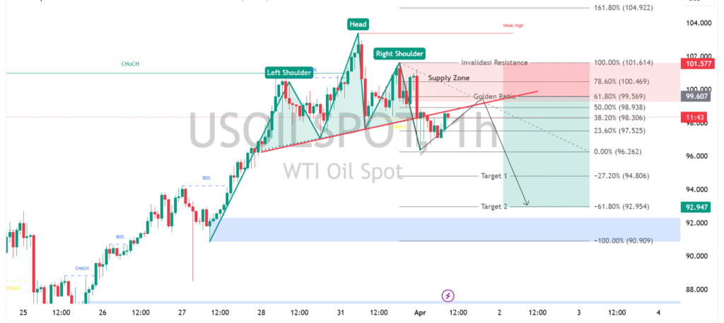 Pergerakan West Texas Intermediate crude oil (WTI) pada timeframe 1 jam menunjukkan pola head and shoulders yang mulai terkonfirmasi, menandakan potensi pembalikan arah setelah tren naik sebelumnya. Harga gagal bertahan di area resistance sekitar 101,5 dan membentuk lower high di sisi right shoulder, diperkuat dengan penembusan garis neckline. Struktur ini mengindikasikan tekanan jual mulai mendominasi, terlebih setelah munculnya perubahan karakter (ChoCh) yang mempertegas pergeseran momentum ke arah bearish.