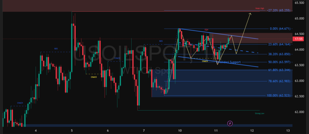 Secara teknikal, pergerakan USOIL menunjukkan fase konsolidasi setelah reli tajam yang membentuk struktur higher high dan higher low. Harga kini bergerak di dalam pola penurunan kecil (descending channel) dengan area 63.50–63.60 menjadi zona support penting yang bertepatan dengan level Fibonacci tengah dan area demand sebelumnya. Selama harga bertahan di atas area ini, peluang pantulan tetap terbuka dengan struktur pasar yang masih mempertahankan bias naik jangka pendek.