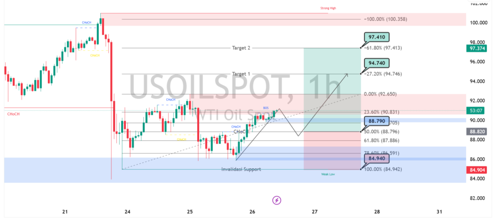 Harga minyak WTI pada timeframe 1 jam menunjukkan sinyal pemulihan setelah membentuk struktur higher low yang kuat di area support sekitar 84.90. Pergerakan bullish mulai terkonfirmasi dengan munculnya break of structure (BOS) di dekat level 90.00, menandakan momentum beli kembali mendominasi. Selama harga mampu bertahan di atas area support minor 88.70 – 89.00, potensi kenaikan masih terbuka dengan target terdekat di kisaran 94.70 hingga 97.40.