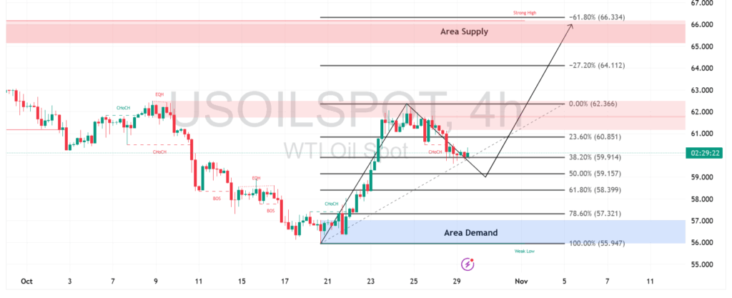 Harga minyak mentah WTI saat ini menunjukkan potensi koreksi setelah mengalami kenaikan signifikan dari area Demand di sekitar level $56–$58. Terlihat adanya pola Change of Character (ChoCH) yang menandakan peralihan momentum dari bearish ke bullish di area tersebut. Pembeli berhasil mendorong harga menuju zona Supply minor di sekitar $62, sebelum terjadi penurunan kembali ke area retracement Fibonacci 38,2–61,8% sebagai potensi area re-entry beli.