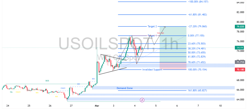 Harga USOIL (WTI) pada grafik satu jam menunjukkan struktur bullish setelah terjadi breakout kuat disertai break of structure yang mengangkat harga dari area demand menuju puncak terbaru. Saat ini pergerakan sedang melakukan konsolidasi sehat di atas level Fibonacci 38,2% – 50%, menandakan minat beli masih terjaga. Selama harga bertahan di atas area support kunci sekitar 71 – 70 dolar, peluang melanjutkan kenaikan tetap terbuka dengan target terdekat di sekitar 77 dolar dan potensi ekstensi menuju area 79 dolar sebagai resistance berikutnya.