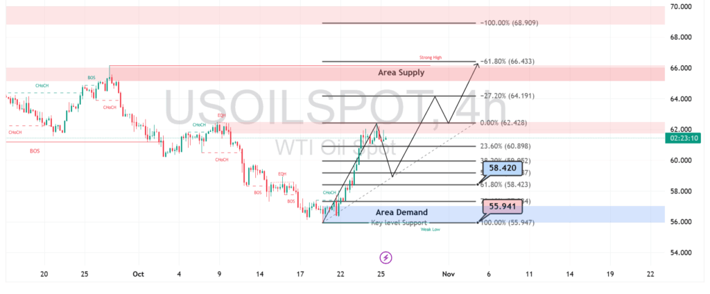 Harga minyak WTI kembali menguat setelah memantul dari area demand $55,94–$58,42, menandakan momentum beli mulai pulih. Struktur harga di grafik 4 jam menunjukkan potensi kelanjutan tren naik menuju resistance penting di $62,42.