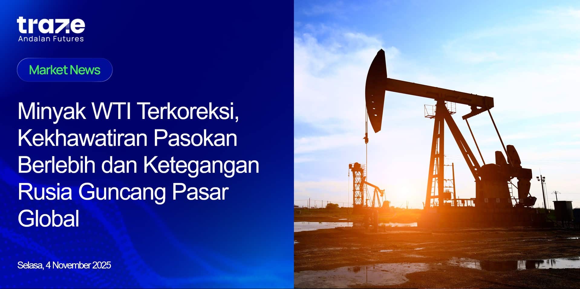 Harga minyak mentah West Texas Intermediate (WTI) kembali melemah ke bawah $61 per barel pada Selasa (04/11), setelah sempat menguat empat hari beruntun. Tekanan jual muncul akibat kekhawatiran berlanjutnya kelebihan pasokan meski OPEC+ memutuskan menunda kenaikan produksi hingga awal tahun depan. Kelompok produsen tersebut sebelumnya menyetujui penambahan pasokan kecil untuk Desember, namun akan menghentikan peningkatan produksi pada Januari–Maret karena permintaan musiman yang cenderung menurun.