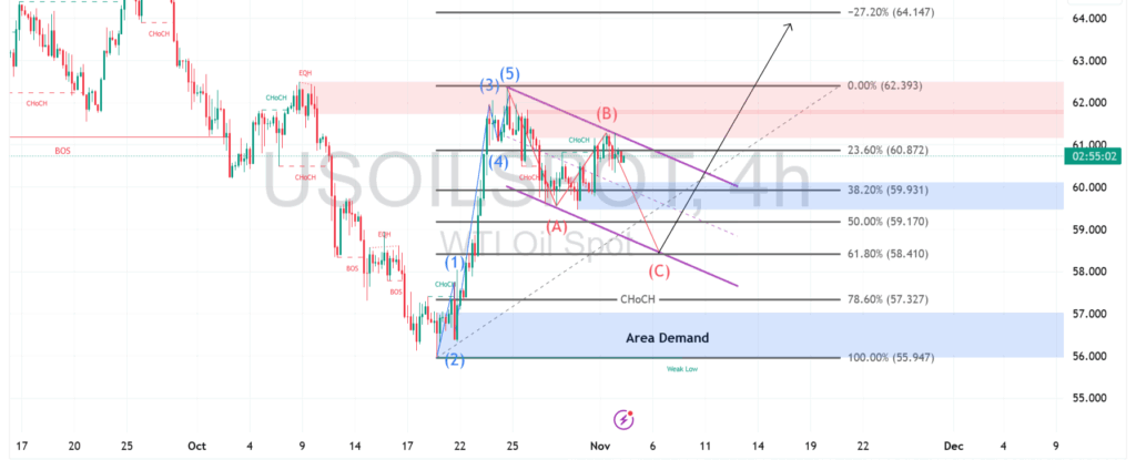 Minyak diperkirakan akan turun sedikit lagi (gelombang C) untuk menguji zona support tersebut. Jika $58.41 ditembus, koreksi bisa memanjang hingga ke area Demand yang lebih dalam, yaitu sekitar $56.00 hingga $57.00.