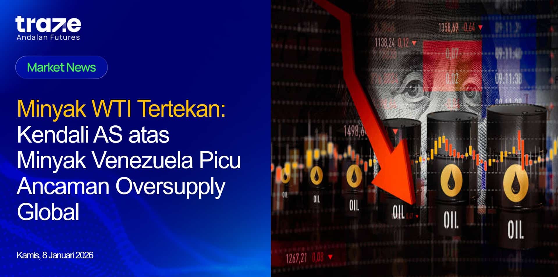 West Texas Intermediate (WTI) kembali jatuh untuk hari kedua berturut-turut, dipicu kekhawatiran pasar terhadap pasokan yang melimpah setelah Amerika Serikat menyatakan akan menjual minyak Venezuela ke pasar global. Sentimen ini menekan harga WTI mendekati level yang terakhir terlihat pada pertengahan Desember, seiring tekanan jual terus mendominasi perdagangan minyak mentah.