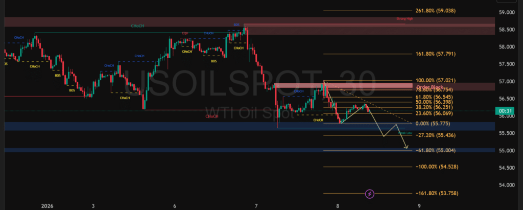 Harga WTI Oil masih berada dalam tekanan setelah gagal bertahan di area supply zone sekitar 57.0–57.8, yang bertepatan dengan order block dan retracement Fibonacci 78.6%. Penolakan kuat di zona tersebut memicu pergeseran struktur pasar ke arah bearish, ditandai dengan munculnya Change of Character (CHoCH) dan penurunan beruntun menuju area konsolidasi bawah. Selama harga tetap bergerak di bawah resistance ini, peluang pemulihan dinilai terbatas.