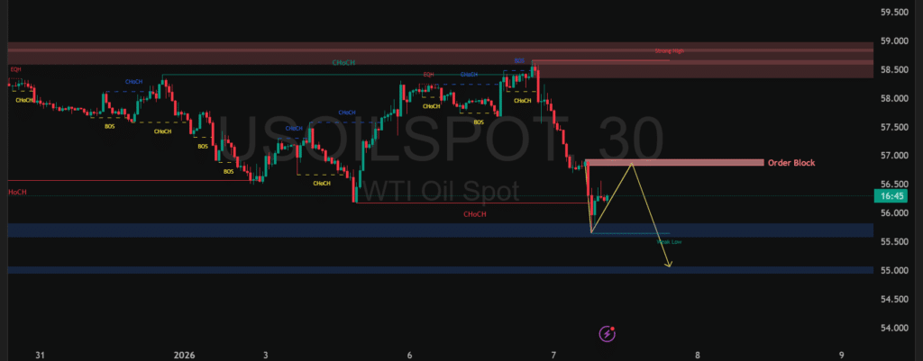 Harga minyak WTI (USOIL) menunjukkan tekanan lanjutan setelah gagal bertahan di area strong high 58,80 – 59,00. Struktur pasar berubah bearish, ditandai CHoCH (Change Of Character) dan BOS (Break Of Structure) ke bawah, sementara penembusan support 56,50 mengonfirmasi dominasi penjual meski sempat terjadi pantulan teknikal jangka pendek.