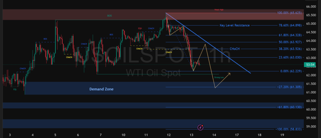 WTI Oil pada timeframe satu jam masih berada dalam tekanan setelah gagal bertahan di area resistance 64.80 – 65.60. Munculnya change of character dan penembusan tren turun mengindikasikan dominasi seller, dengan harga kini menguji support 62.20.