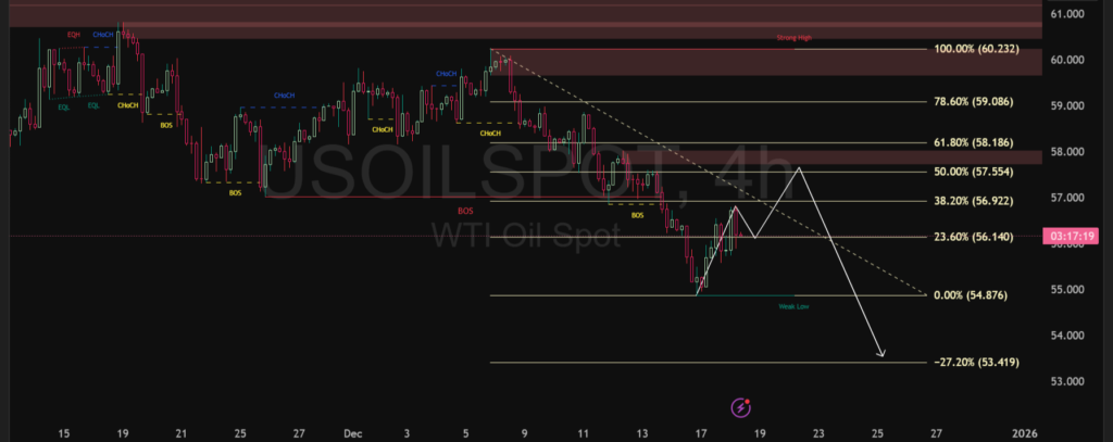 Harga minyak WTI (USOIL) masih bergerak di bawah tekanan setelah gagal mempertahankan momentum pemulihan, dengan harga tertahan di area $56,00 – $56,20. Secara teknikal, struktur pasar menunjukkan tren bearish yang masih dominan, terlihat dari rangkaian lower high serta penolakan harga di area Fibonacci 23,6% – 38,2%, yang kini berperan sebagai zona resistance dinamis.