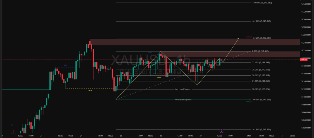 Dari sisi teknikal, pantulan dari area Fibonacci 61,8% mengindikasikan respons beli yang cukup solid. Skenario positif mengarah pada breakout bersih di atas 5.220 untuk membuka ruang kenaikan menuju 5.250 hingga 5.295. Sebaliknya, kegagalan mempertahankan support dapat memicu tekanan jual jangka pendek dan membawa harga kembali ke zona demand lebih rendah. Dengan struktur yang masih konstruktif, fokus trader saat ini tertuju pada konfirmasi penembusan resistance sebagai pemicu momentum berikutnya.
