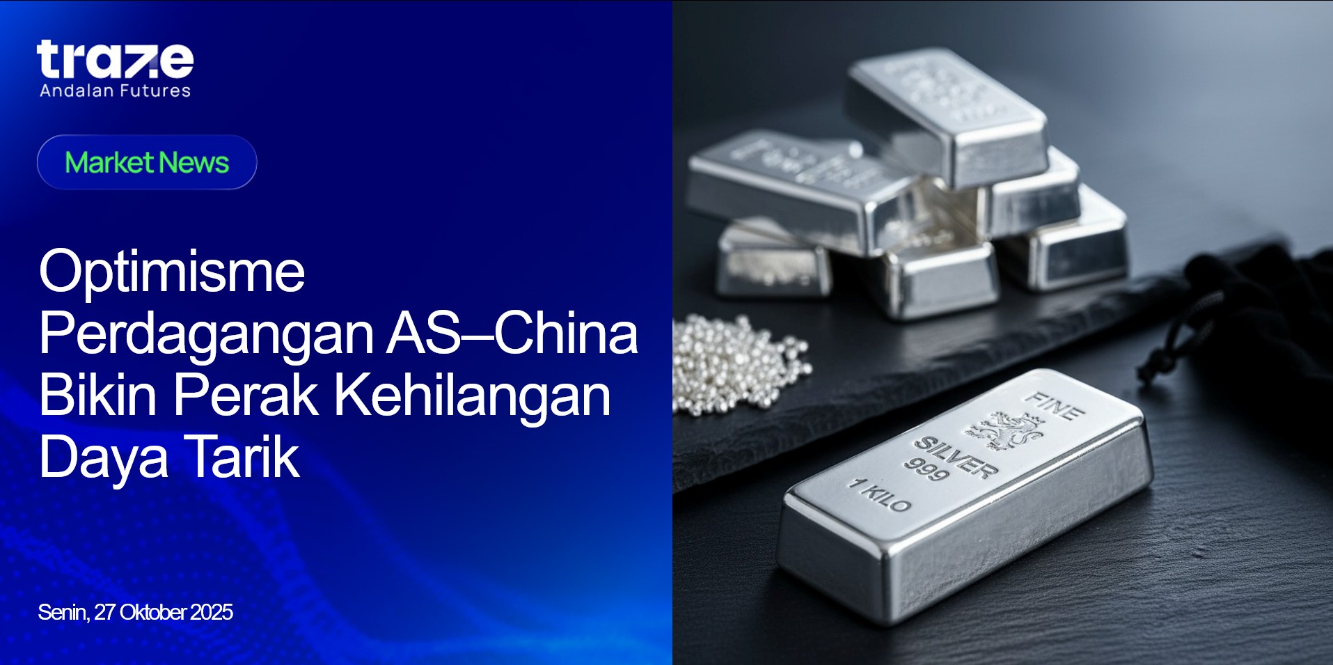 Harga perak kembali melemah menuju level $48 per ounce pada Senin (27/10), melanjutkan penurunan dari pekan sebelumnya. Penurunan ini dipicu oleh meningkatnya optimisme terhadap kemajuan negosiasi dagang antara Amerika Serikat dan China, yang mengurangi minat investor terhadap logam safe haven. Pasar kini menaruh harapan besar pada pertemuan Presiden Donald Trump dan Presiden Xi Jinping pada Kamis mendatang, setelah pembicaraan akhir pekan lalu menghasilkan kesepakatan awal atas sejumlah isu penting.