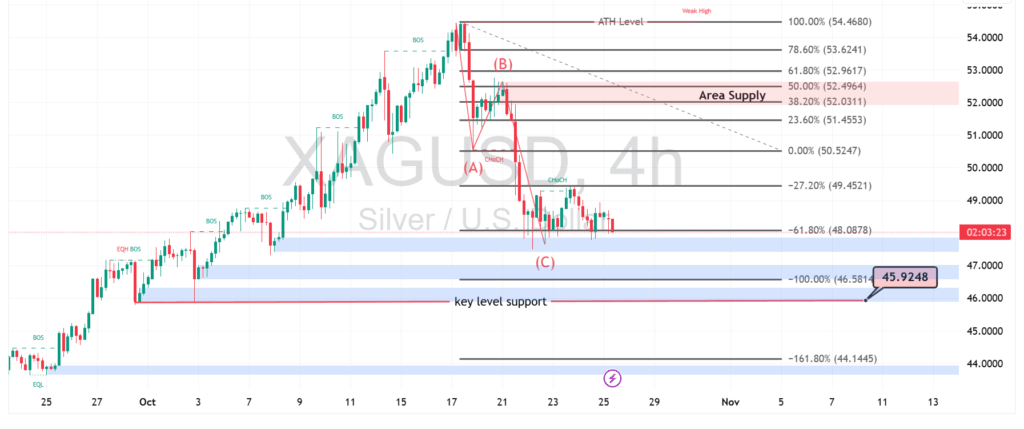 Pergerakan XAGUSD pada grafik empat jam memperlihatkan tekanan jual kuat setelah gagal menembus area supply di sekitar 52 dolar. Pola ABC korektif menunjukkan gelombang C kini mendekati zona support utama di 45,9 dolar, yang menjadi titik penting untuk menentukan arah berikutnya—apakah akan terjadi pantulan atau kelanjutan tren turun.