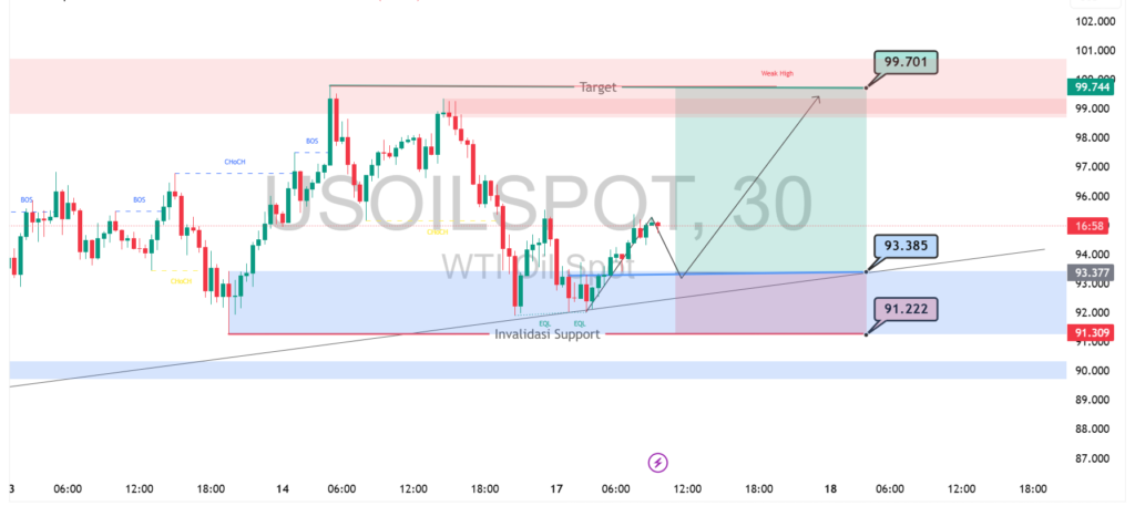 Analisis teknikal WTI crude oil pada timeframe 30 menit menunjukkan harga mulai membentuk pemulihan setelah sebelumnya menyentuh area support kuat di sekitar 91–93. Struktur pergerakan saat ini memperlihatkan pantulan dari zona demand serta terbentuknya kenaikan bertahap yang didukung garis tren naik jangka pendek. Selama harga mampu bertahan di atas area 93, momentum bullish masih berpeluang berlanjut.