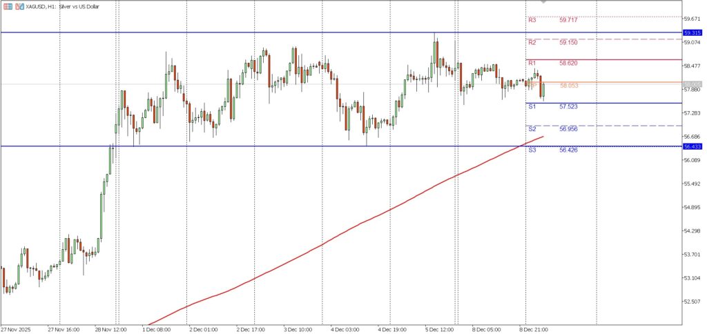 XAGUSD bergerak di sekitar pivot 58.053 dengan tren masih condong naik selama harga bertahan di atas EMA merah. Level penting hari ini berada pada R1: 58.620, R2: 59.150, R3: 59.717, sementara support berada di S1: 57.523, S2: 56.956, dan S3: 56.426. Area 57.52 – 56.95 menjadi zona kuat buyer, sedangkan penolakan di 58.62 menunjukkan tekanan seller masih ada.