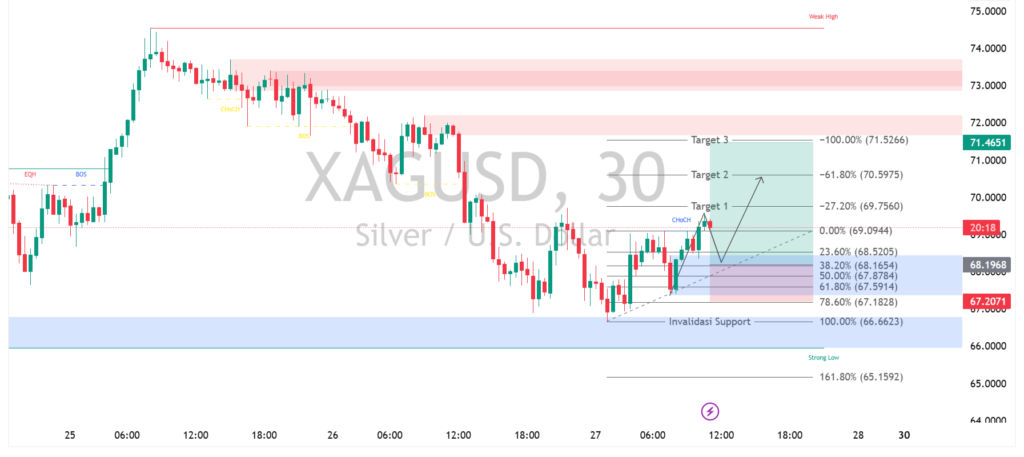 Pergerakan XAGUSD pada timeframe 30 menit menunjukkan upaya pemulihan setelah tekanan jual kuat dalam beberapa sesi terakhir. Harga saat ini mencoba bertahan di atas area retracement Fibonacci sekitar 38.2% – 50.0%, yang menjadi zona krusial untuk menjaga momentum bullish jangka pendek. Struktur mulai membentuk higher low, diperkuat dengan munculnya sinyal perubahan karakter (ChoCH) yang mengindikasikan potensi pembalikan arah. Selama harga mampu bertahan di atas area support ini, peluang kenaikan masih terbuka.