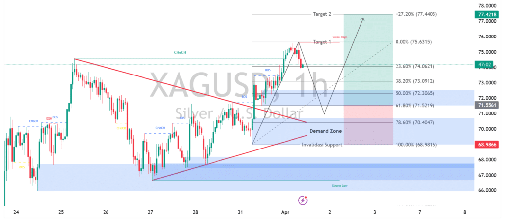 Pergerakan XAGUSD pada timeframe 1 jam menunjukkan momentum bullish mulai terbentuk setelah terjadi break of structure (BOS) yang mendorong harga naik ke area resistance sekitar 75.60. Namun, muncul reaksi penolakan di level tersebut yang membentuk pola koreksi jangka pendek. Saat ini harga sedang menguji area Fibonacci 23.6% hingga 38.2% di kisaran 74.00 – 73.00 sebagai zona penopang awal. Selama harga mampu bertahan di atas area ini, peluang kelanjutan kenaikan masih terbuka dengan target kembali menguji resistance sebelumnya.
