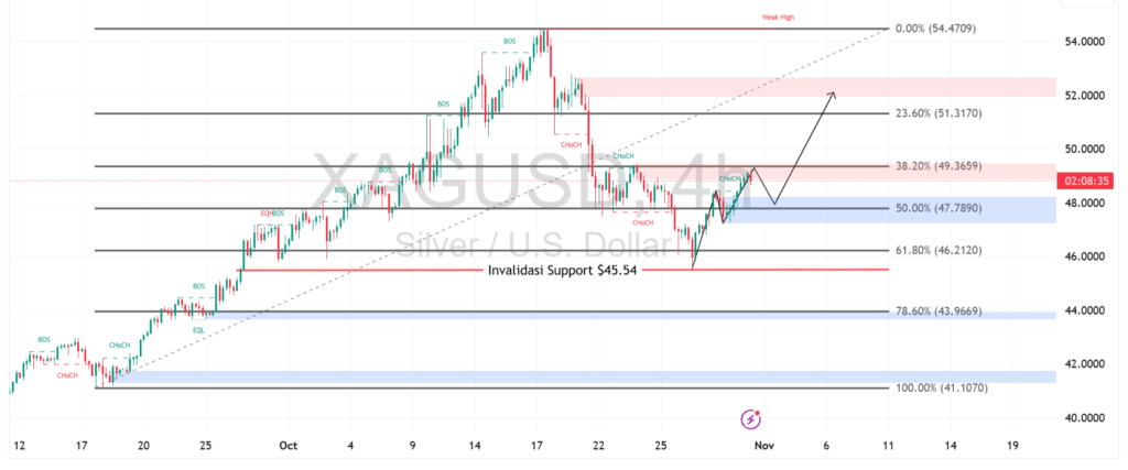 Struktur harga pada grafik 4 jam menunjukkan serangkaian Change of Character (ChoCH) dan Break of Structure (BOS) yang mengonfirmasi transisi menuju tren naik jangka menengah. Jika perak mampu bertahan di atas zona biru saat ini, peluang untuk menguji area resistance Fibonacci 38,2% di kisaran $49,3 hingga $51 akan semakin besar.