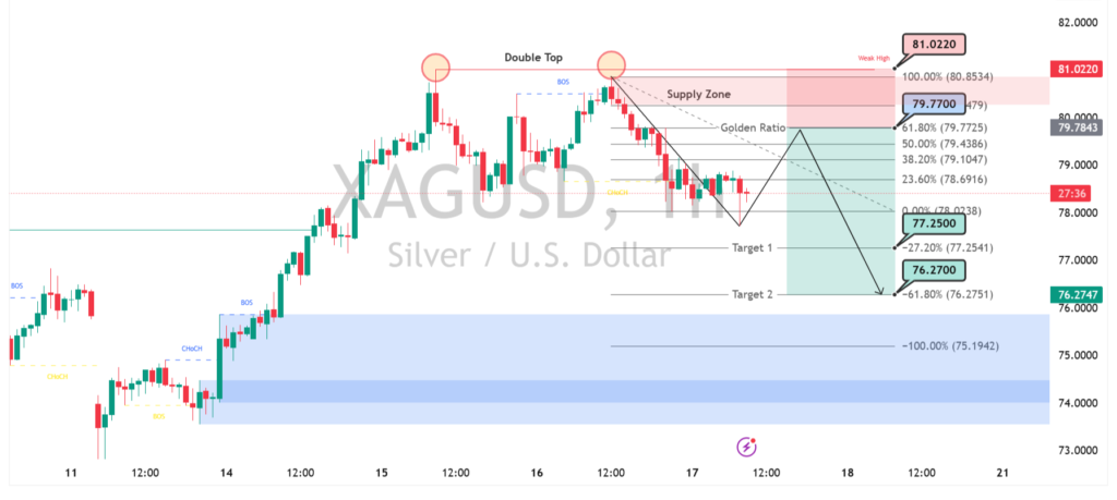 Pergerakan XAGUSD pada timeframe 1 jam menunjukkan sinyal pelemahan setelah terbentuk pola double top di area sekitar 81.00, yang menjadi indikasi kuat potensi pembalikan arah. Harga gagal menembus zona supply dan justru mengalami tekanan turun, diperkuat oleh struktur lower high yang mulai terbentuk. Selain itu, area golden ratio Fibonacci di kisaran 79.70 menjadi titik krusial yang saat ini sedang diuji, menandakan pasar berada dalam fase penentuan arah lanjutan.