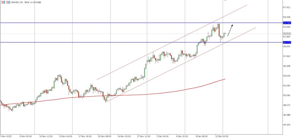 Pergerakan perak (XAGUSD) pada timeframe H4 masih menunjukkan tren naik yang solid dengan harga bertahan di atas support penting 60,77. Struktur channel bullish menandakan dominasi buyer tetap kuat meski sempat terjadi koreksi ringan.